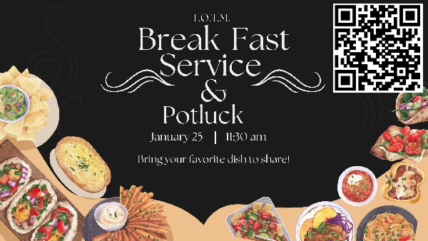 Join us for our breaking fast service. Potluck immediately following service. Sign up to bring your favorite side food dish to share with others.