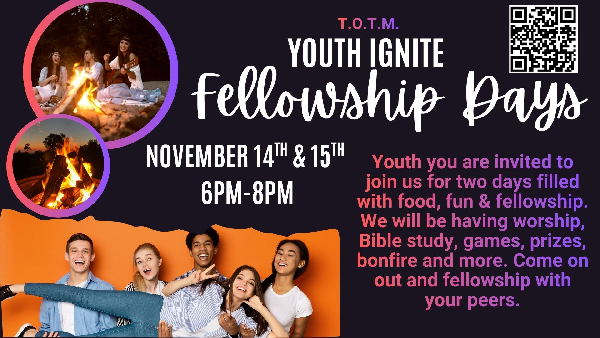 Youth you are invited to join us for two days filled with food, fun & fellowship. We will be having worship, Bible study, games, prizes, bonfire and more. Come on out and fellowship with your peers.