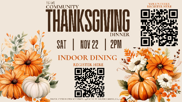 Touch of the Master Ministries invites you to come enjoy a hot Thanksgiving meal. This is a walk in and dine with us event.